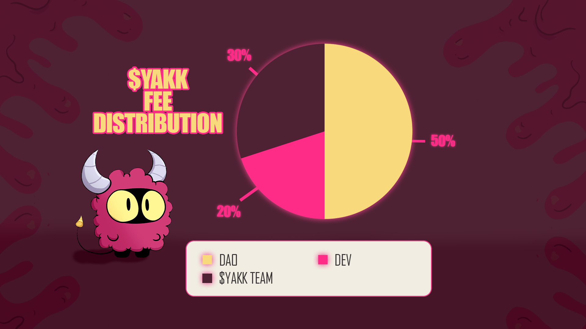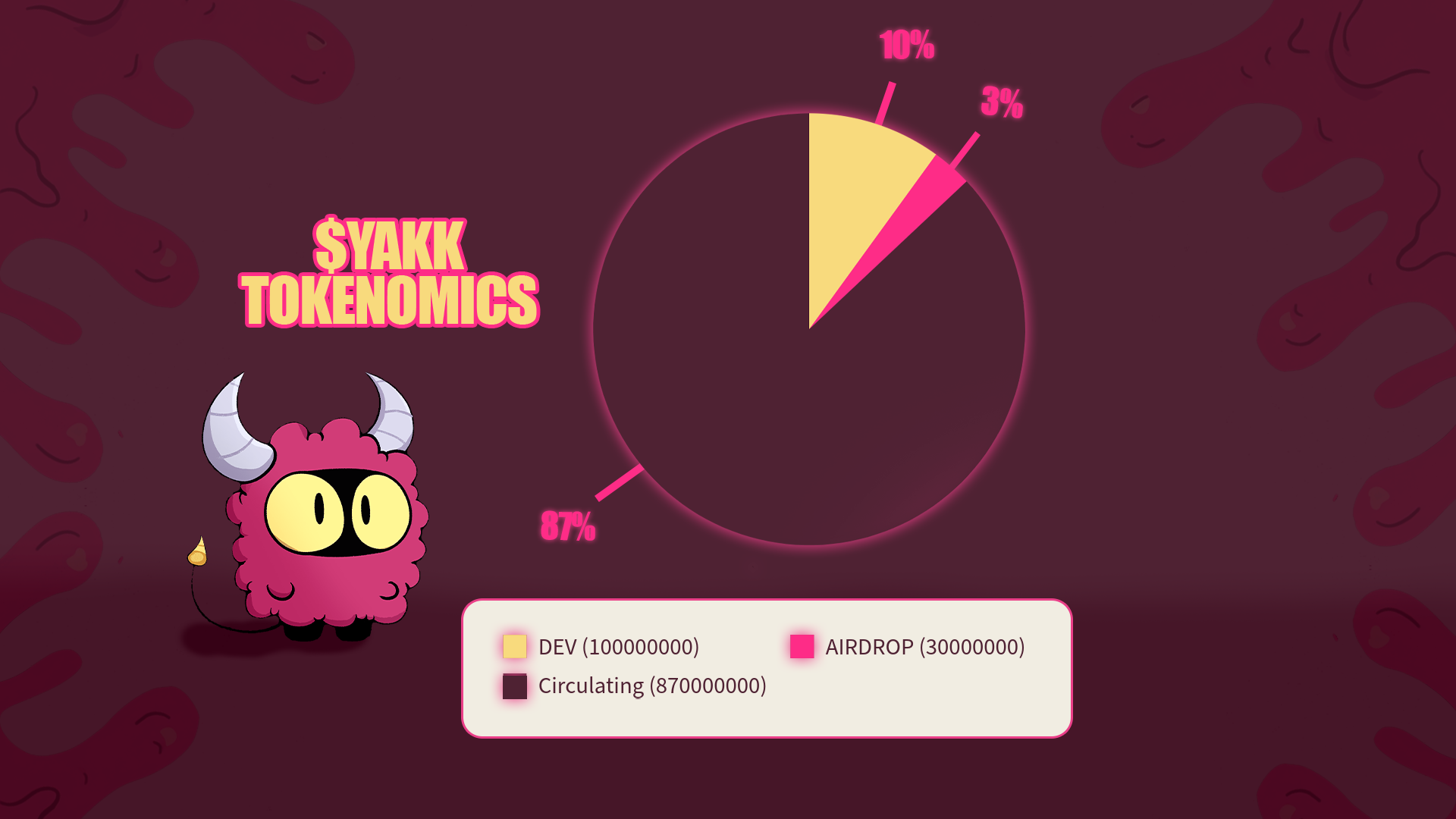 10% Dev (bought back for longevity, listings, collabs – Currently 5% locked + extra 5% being locked soon) 3% Airdrop Locked(rewarding early YAKKED fam)